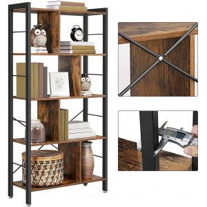 Jedinečný mix vintage a industriálního stylu. Vícekomorová knihovna nabízí spoustu úložného prostoru. Kancelářský regál je vybaven bočními lištami, které zabraňují vypadnutí předmětů. Dodáváme také nastavitelné nožky, které vyrovnávají mírné nerovnosti terénu. Prémiová dřevotříska a odolný ocelový rám dodávají regálu dobrou stabilitu (nosnost až 30 kg na polici), kterou dále zvyšují tyče v zadní části a přiložená ochrana proti převrácení.