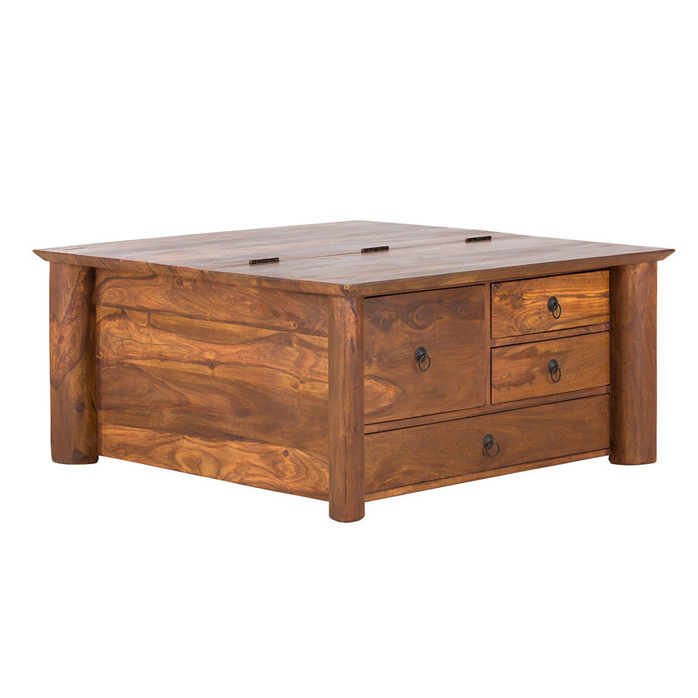Rustykalny stolik kawowy Marilyn emanuje naturalnością i odrobiną wiejskiej sielanki. Meble wykonane są z palisandru, szlachetnego drewna. Ten naturalny materiał jest szczególnie twardy i ciężki i doskonale nadaje się na wysokiej jakości meble wiejskie. Powierzchnia mebli do salonu jest lakierowana. Cztery szuflady w różnych rozmiarach oferują również praktyczną przestrzeń do przechowywania. Stół można również otworzyć z tyłu - stolik w kilka chwil staje się elegancką komodą. Eleganckie metalowe okucia i uchwyty doskonale uzupełniają całościowy obraz.