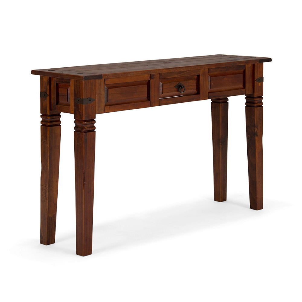 Prawdziwe piękno: konsola Catalina tworzy rustykalne akcenty w każdym salonie. Bordowy kolor litego drewna sosnowego emanuje naturalnością. Uderzające rysunki i ślady użytkowania celowo wprowadzone do drewna – takie jak drobne przetarcia, tunele czasoprzestrzenne i różne niuanse kolorystyczne – dopełniają wyrazu żywej wiejskiej kultury i śródziemnomorskich sielanek. Okucia i uchwyty z żelaznego pierścienia podkreślają rustykalny aromat. Szuflada na środku oferuje dużo miejsca na klucze, biżuterię, dokumenty. Krawędzie stołu są zaokrąglone. Konsola Catalina - idealna propozycja dla fanów rustykalnego domu.