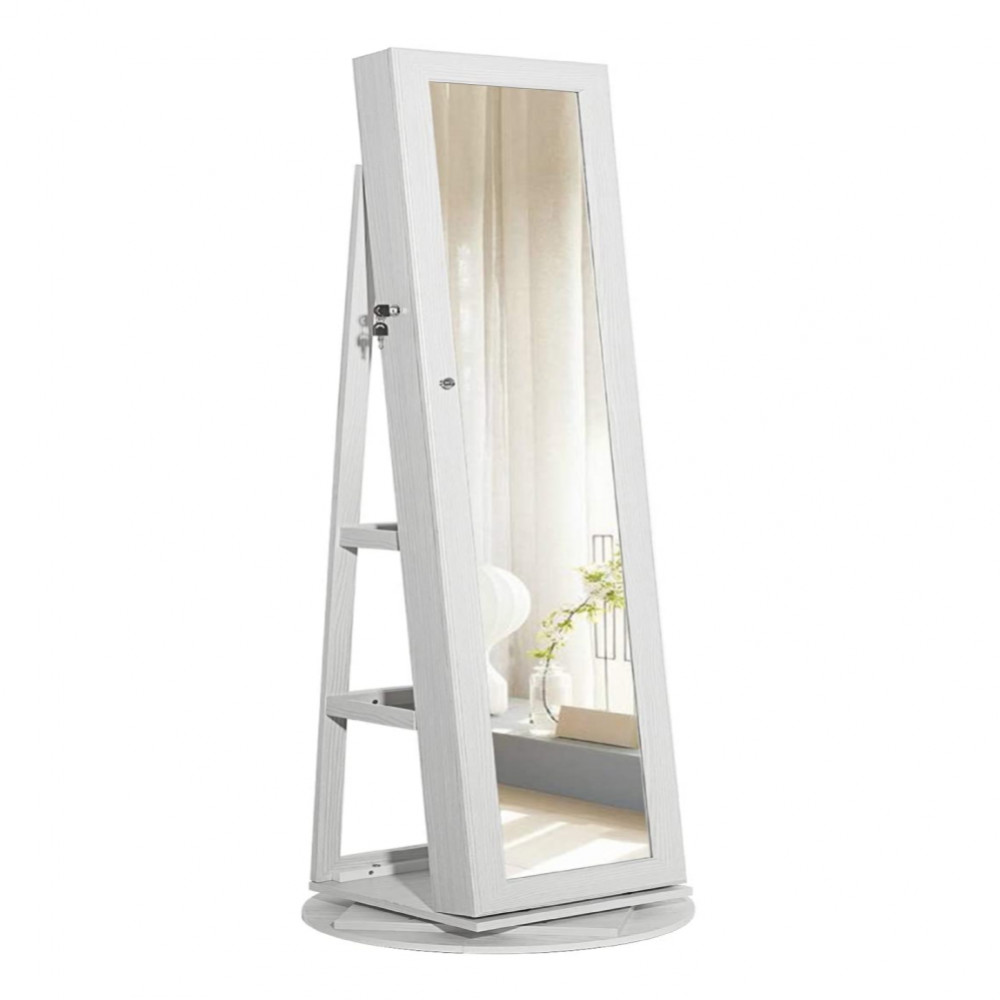 Pudełko na biżuterię, lustro toaletowe i półka do przechowywania do jednego, ten element nadaje się do użytku. Dzięki funkcji obrotu 360° może idealnie wyświetlać biżuterię pod dowolnym kątem. 2 półki z tyłu szafki lustrzanej oferują opcje przechowywania toreb, narzędzi do makijażu i elementów odzieży. Dolna krawędź obudowy znajduje się prawie na ziemi, co pozwala na więcej miejsca do przechowywania. Dzięki wbudowanemu lusteru nie ma potrzeby zamykania drzwi podczas tworzenia lub noszenia biżuterii, aby spojrzeć w lustro. Ta obudowa jest wykonana z płyty o wysokiej gęstości i połączona za pomocą sprzętu o wysokiej wytrzymałości, z narzędziem blokującym i 2 klawiszami. Jest bezpieczny i niezawodny. Drzwi można mocno zamknąć magnesem drzwiowym.