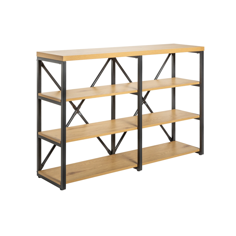Półka wykonana jest z metalowej konstrukcji w kolorze czarnym w połączeniu z dębowymi półkami. Półka oferuje miejsce na książki, artykuły piśmiennicze lub różne ozdoby. Lekkie półki tworzą jeden świetny kontrast z ciemną metalową ramą, która jest wzmocniona z tyłu krzyżującymi się metalowymi rozpórkami, co zapewnia lepszą stabilność całej półki. Półkę można również wykorzystać jako przegrodę pokoju. Ta półka z pewnością znajdzie swoje miejsce w gabinecie, bibliotece czy w gabinecie.