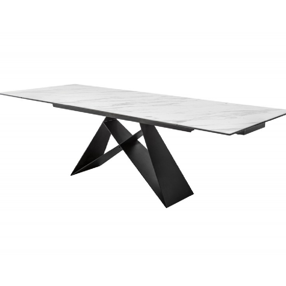 Stół do jadalni Gabon to niezwykły mebel, który wzbogaci Twoje wnętrze. Dominuje w nim duży blat wykonany z wysokiej jakości włoskiej ceramiki, co nadaje mu wyjątkowej trwałości. Powierzchnia deski wykonana jest w ciemnoszarym odcieniu. Solidne nogi krzyżowe w industrialnym stylu doskonale kontrastują z blatem stołu. Kolejną szczególną cechą mebla są dwa przedłużenia, które można łatwo złożyć. Za ich pomocą można przedłużyć stół ze 180cm do 220cm lub nawet do 260cm. Duże rodzinne obiady czy siedzenie z przyjaciółmi nie będą już problemem.