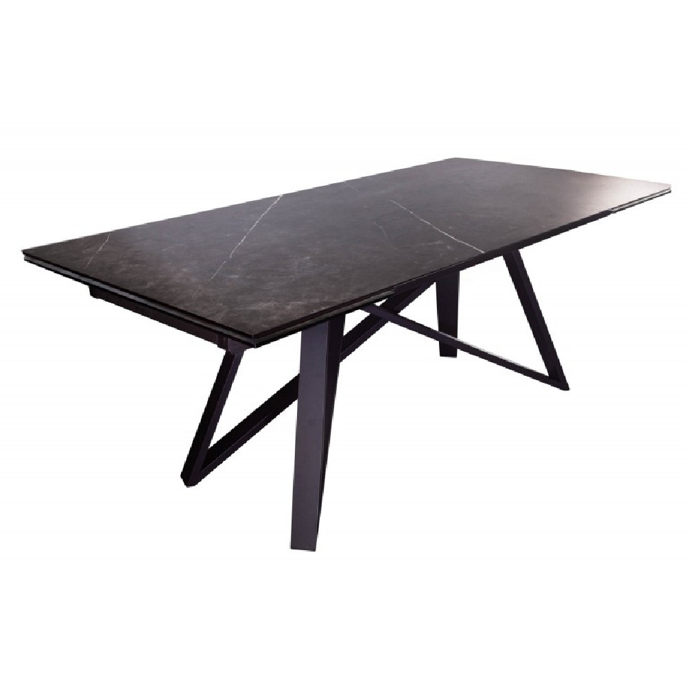 Niezwykły stół do jadalni posiada duży blat wykonany z wysokiej jakości włoskiej ceramiki, który umieszczony jest na blacie ze szkła hartowanego. Jego powierzchnia jest lekko chropowata, co nadaje meblom szlachetny wygląd i charakter. Imponujące skrzyżowane nogi w solidnym, industrialnym stylu tworzą doskonały kontrast. Kolejną szczególną cechą mebla są dwa przedłużenia, które można łatwo złożyć. Za ich pomocą można przedłużyć stół ze 180cm do 220cm lub nawet do 260cm. Duże rodzinne obiady czy siedzenie z przyjaciółmi nie będą już problemem.